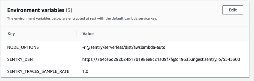 • NODE_OPTIONS: This is to preload the awslambda-auto module which will automatically initialize Sentry