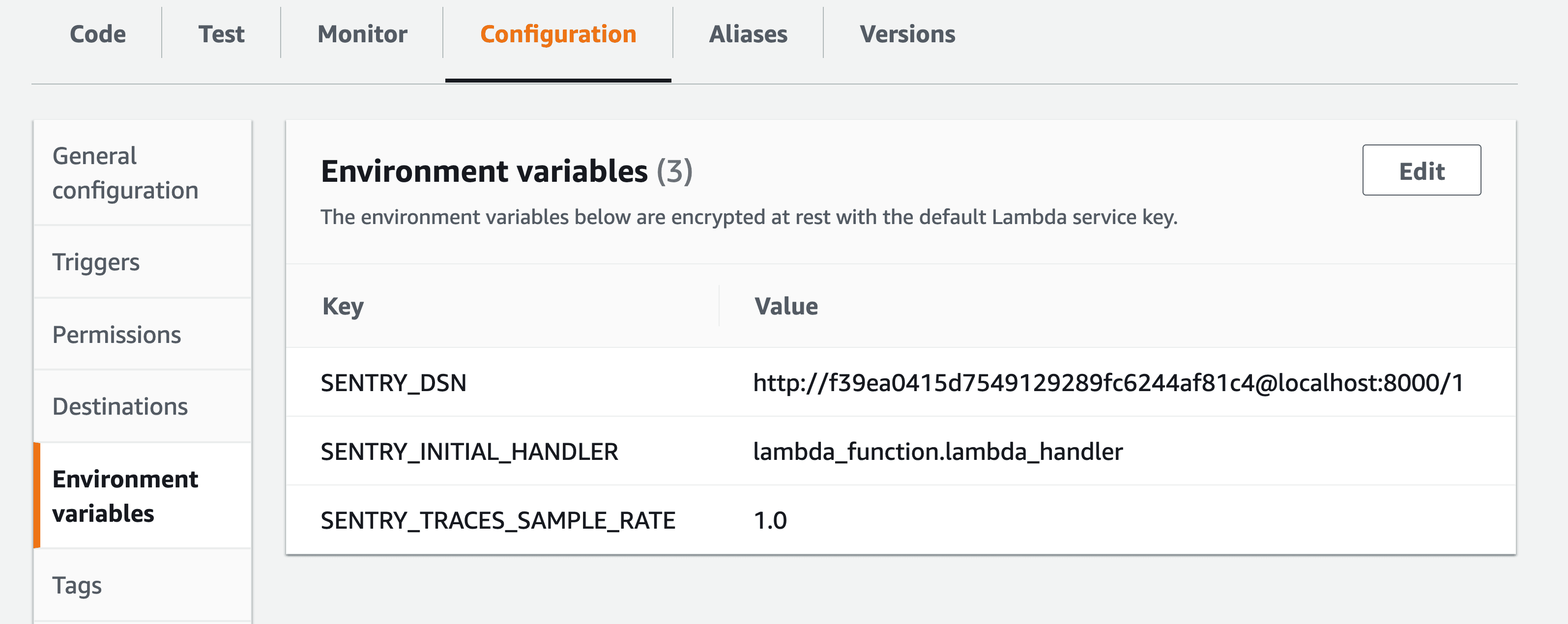 • SENTRY_INITIAL_HANDLER: This stores the value of your Runtime handler. If you choose to disable the Sentry layer, this value will be used to set the Runtime handler.